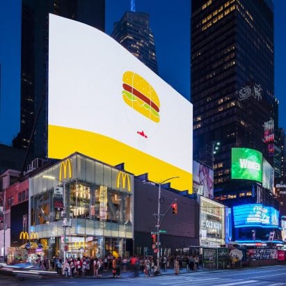 Drawing from McDonald’s original architectural DNA, the renovation pays homage to Ray Kroc’s founding vision while layering in a contemporary material vocabulary. The restaurant’s entrance is dramatically framed by yellow illuminated piers and a mirrored, angled ceiling that guides the eye toward the kitchen—an intentional reference to Kroc’s open kitchen format. Mark Landini refers to this as “Ray+,” merging nostalgic cues with what he calls an “emotional acceleration.” The redesign captures both symbolic continuity and architectural playfulness, blending corporate heritage with spatial spectacle.